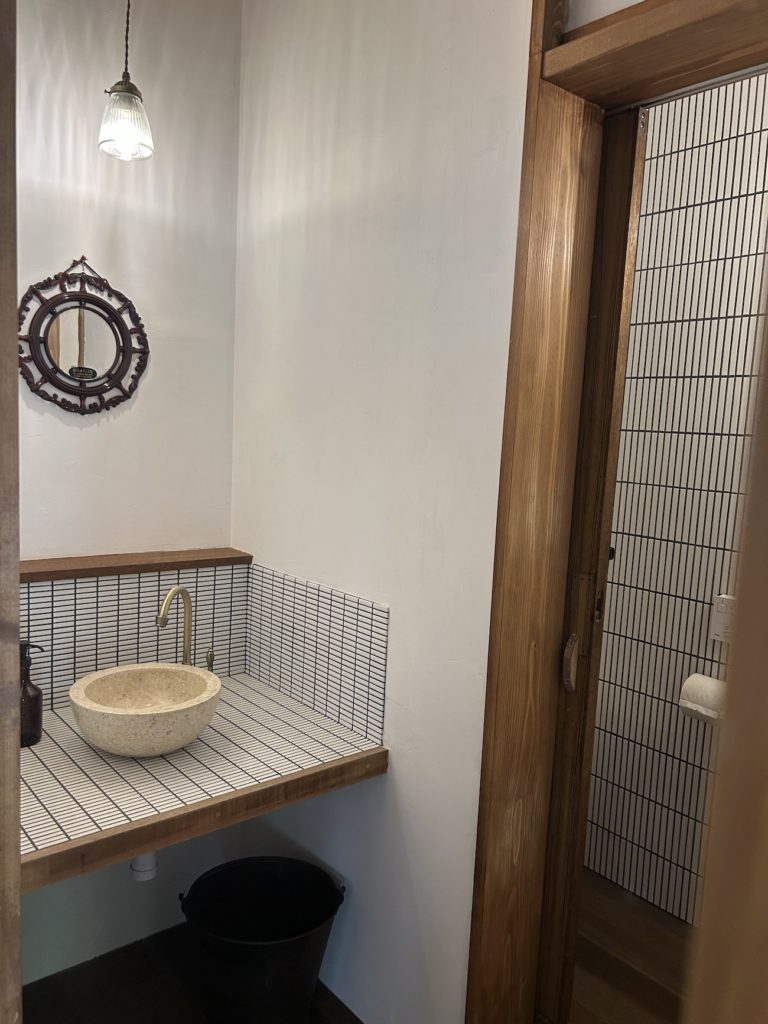 手洗い場は、長方形のタイルで可愛くおめかし。