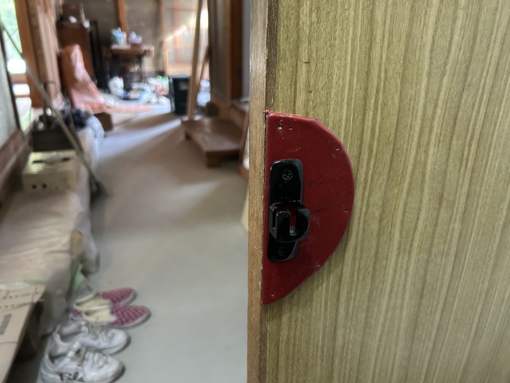 さらに、通り土間の突き当たりにあるもう一つのトイレの内扉には、赤い革細工の仕掛けが。